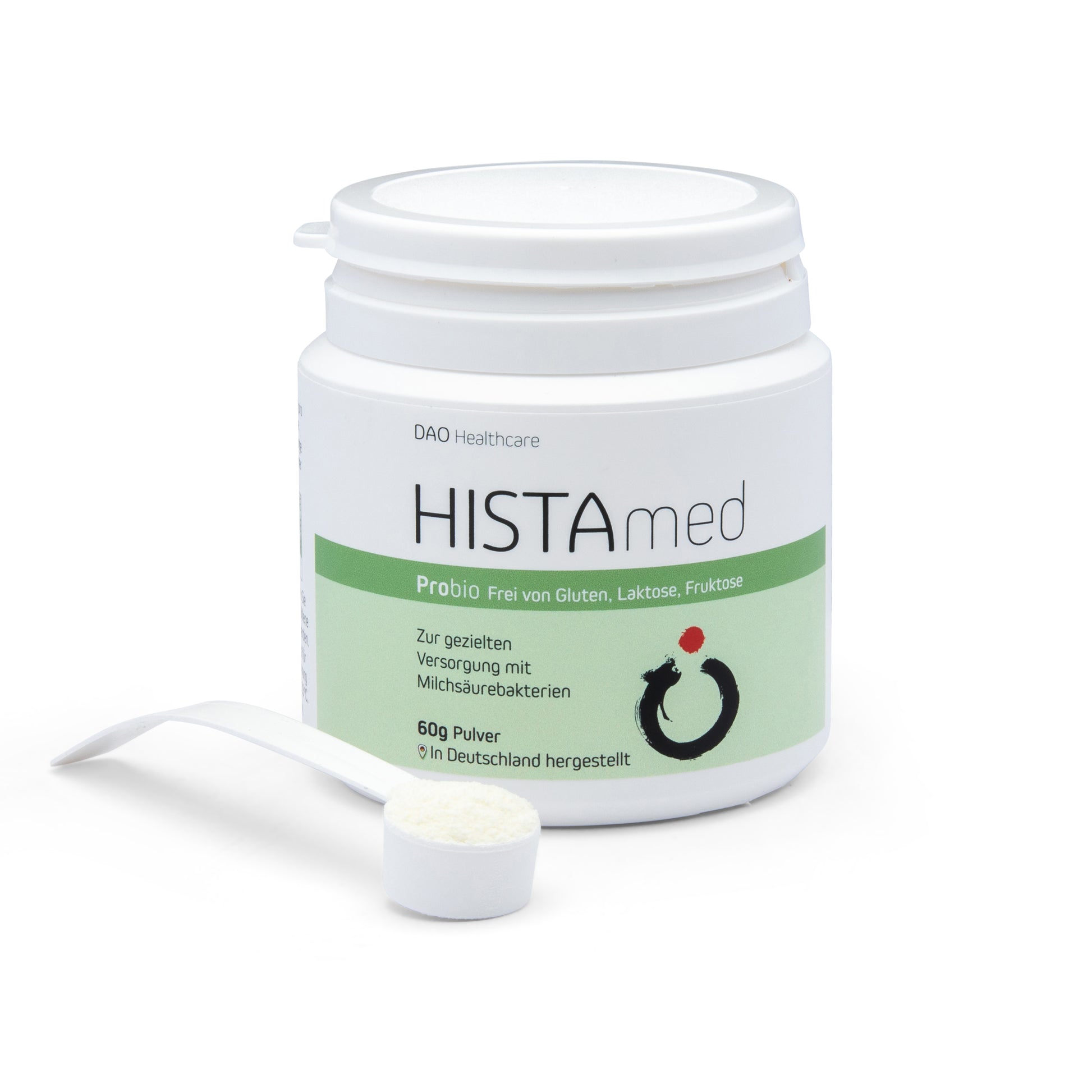 HISTAmed® Probio Pulver enthält die Milchsäurebakterienkulturen Bifidobakterium infantis und Bifidobakterium longum, welche nachweislich kein Histamin produzieren. Zusätzlich werden Reaktionen des Enzyms Histamincarboxylase (baut die Aminosäure Histidin zu Histamin ab) sowie des H1-Rezeptors (vermittelt die bekannten allergischen Reaktionen des Histamins) unterdrückt.