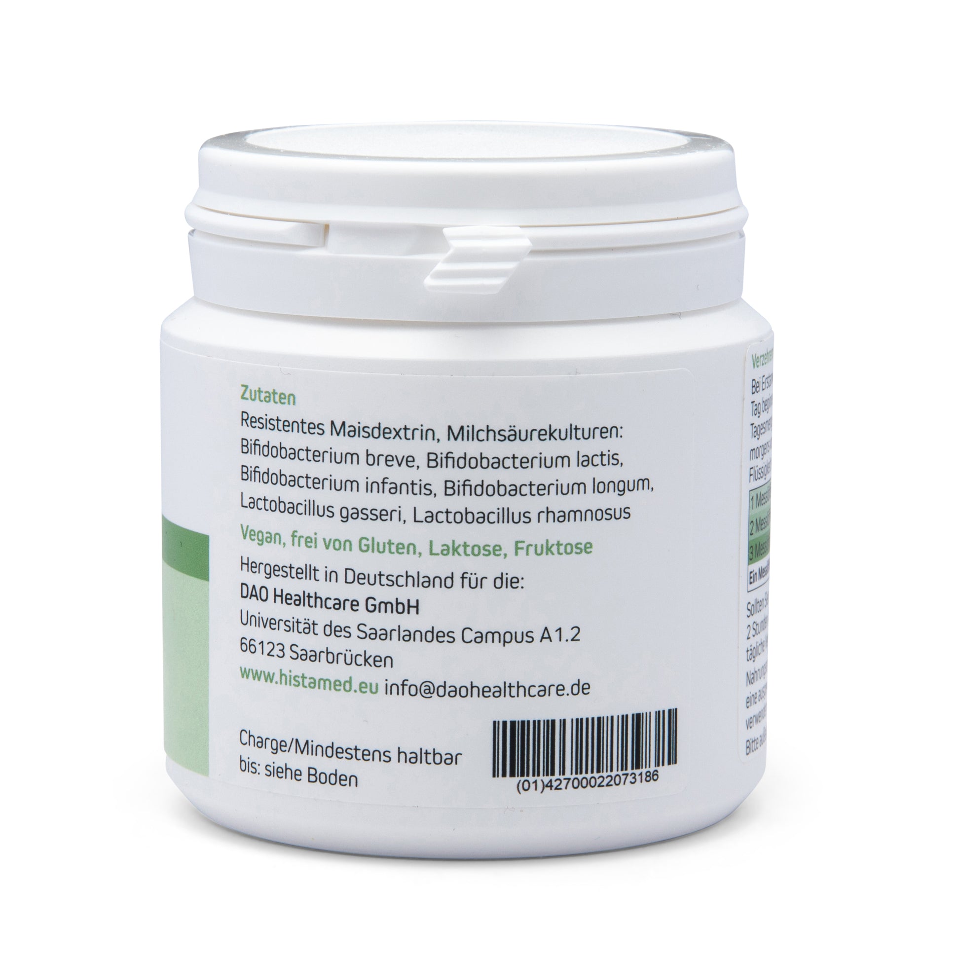 In HISTAmed® Probio Pulver sind die Bakterienstämme Bifidobakterium breve, Bifidobakterium lactis, Bifidobakterium infantis, Bifidobakterium longum, Lactobacillus gasseri und Lactobacillus rhamnosus enthalten. Alle diese Bakterienstämme sind im menschlichen Darm zu finden. Bifidobakterien und Lactobazillen bauen im Magen-Darm-Trakt Zucker, Essigsäure und Milchsäure ab. Dadurch wird das Darmmilieu leicht angesäuert, wodurch es für Krankheitserreger schwierig ist sich zu vermehren. Die sorgfältig ausgewählten, in HISTAmed® Probio Pulver enthaltenen Bakterienstämme sind in der Lage die Darmflora zu unterstützen und Symptome durch Bakterienmangel verringern.